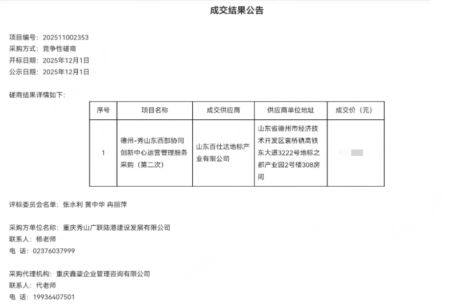百仕达成功中标德州-秀山协同创新中心运营管理服务项目