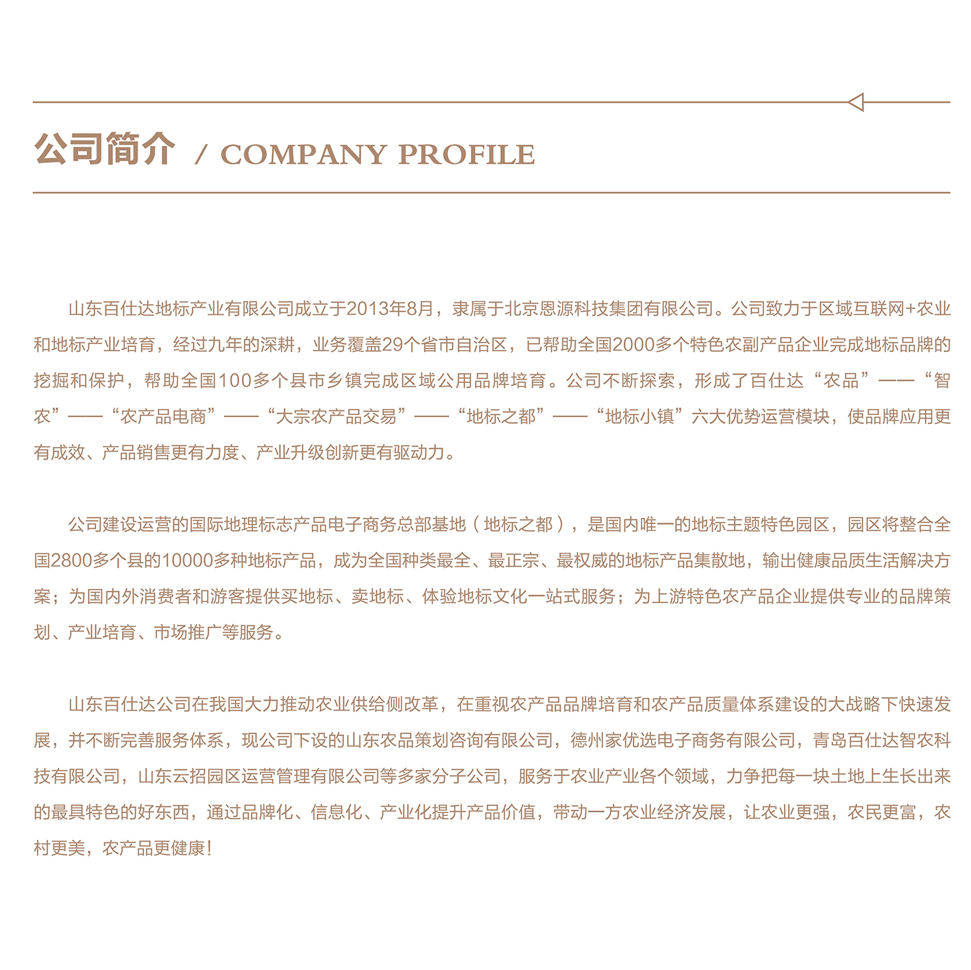 2017年3月,首个县级区域公用品牌“品味南皮”签约成功,标志着区域公用品牌业务上线。 2017年4月,由公司主办的2017首届地理标志产品订货峰会圆满召开。