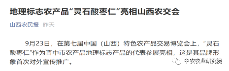 参展结束后,省级报社《山西农民报》公众号针对山西省农产品地理标志“灵石酸枣仁”推送《地理标志农产品“灵石酸枣仁”亮相山西农交会》文章,对“灵石酸枣仁”的本次参展给予了认可。