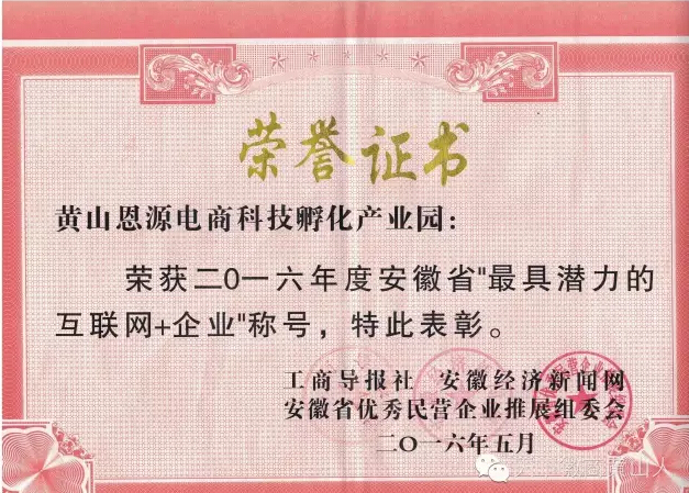 近日,由安徽省优秀民营企业推展组委会、安徽经济新闻网、工商导报社联合主办的安徽省“最具潜力的互联网+企业”评选活动拉下帷幕。在专家的评审结果下,黄山恩源电商科技孵化产业园荣获二0一六年度安徽省“最具潜力的互联网+企业”称号。
